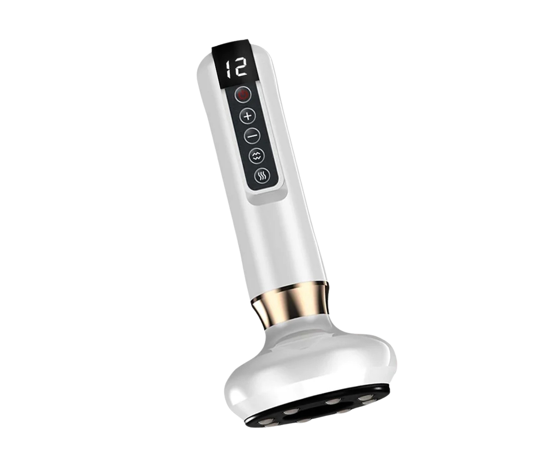 Massajador anti-celulítico 4 em 1: Combina o tradicional gua sha, uma poderosa ventosa, calor infravermelho e vibração para reduzir eficazmente a celulite. Utilização regular durante 1-3 semanas: coxas, barriga, nádegas, para uma pele suave e radiante